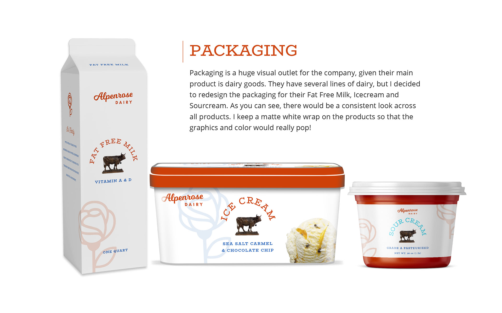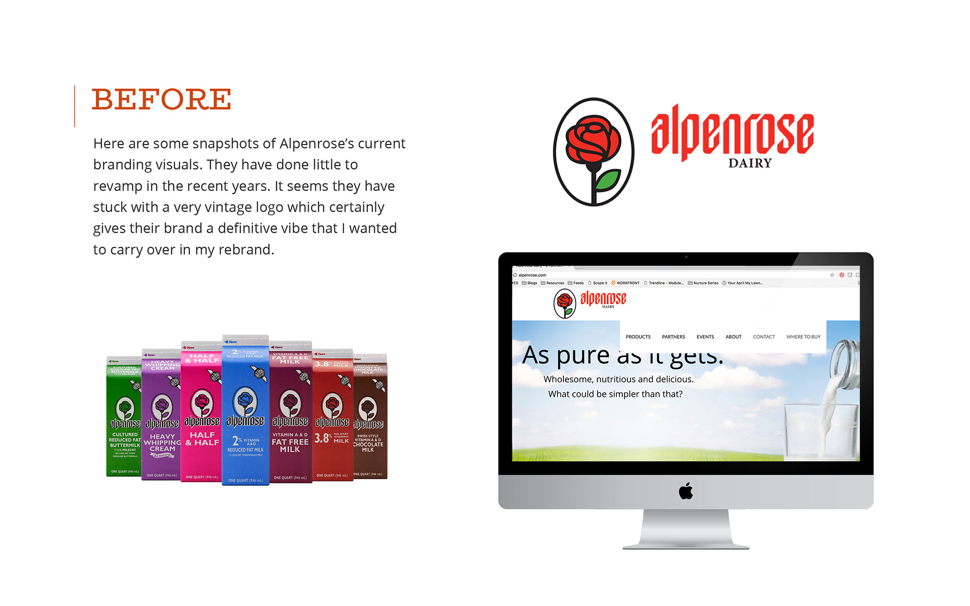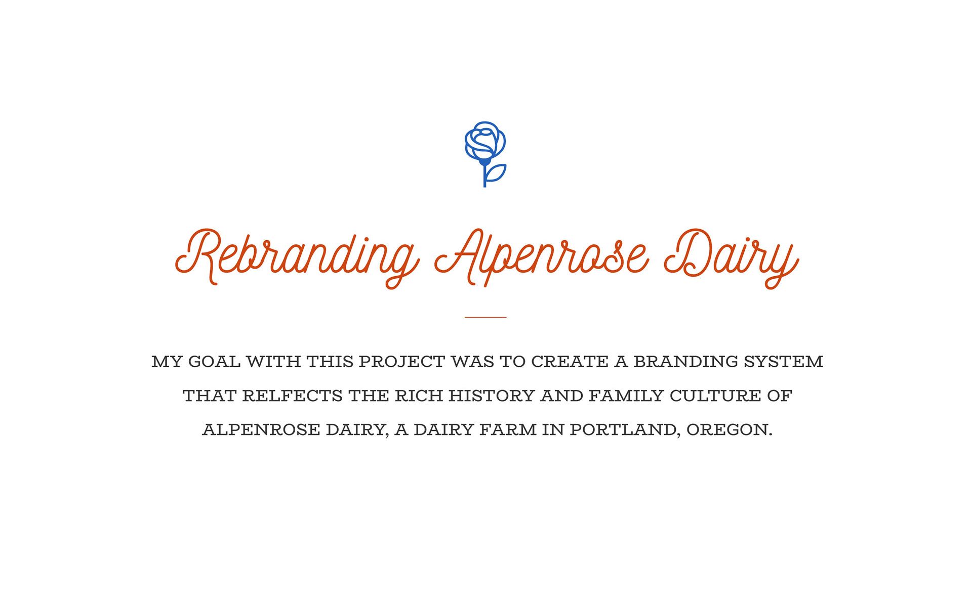 Alpenrose Dairy is a local dairy company in Portland, Oregon. This project rebrands their current look to give them a more updated feel while also staying true to their rich family history and culture.